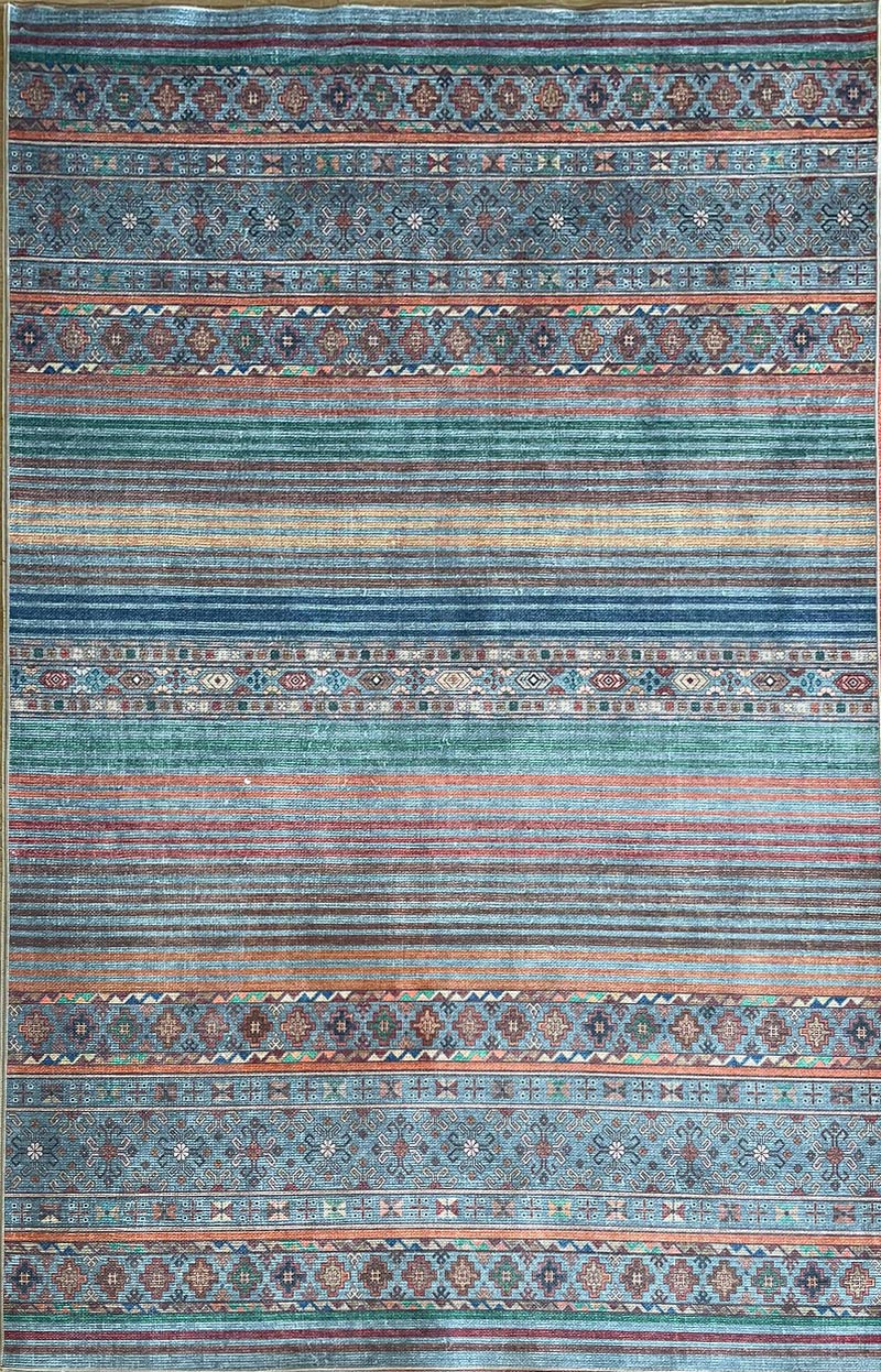 שטיח צבעוני בדוגמה אתנית, דק ויציב על הרצפה.